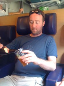 The ticket guy comes by. As he leaves he closes the door. Our plan was to keep it open. Oh well. The train stops again and another bunch of people get on. A woman explains that the previous train did not arrive. Nice. The guy whose seat I’m sitting in shows up and I have to move to the next cabin. Some of the other passengers have shown up. It smells like bananas.
