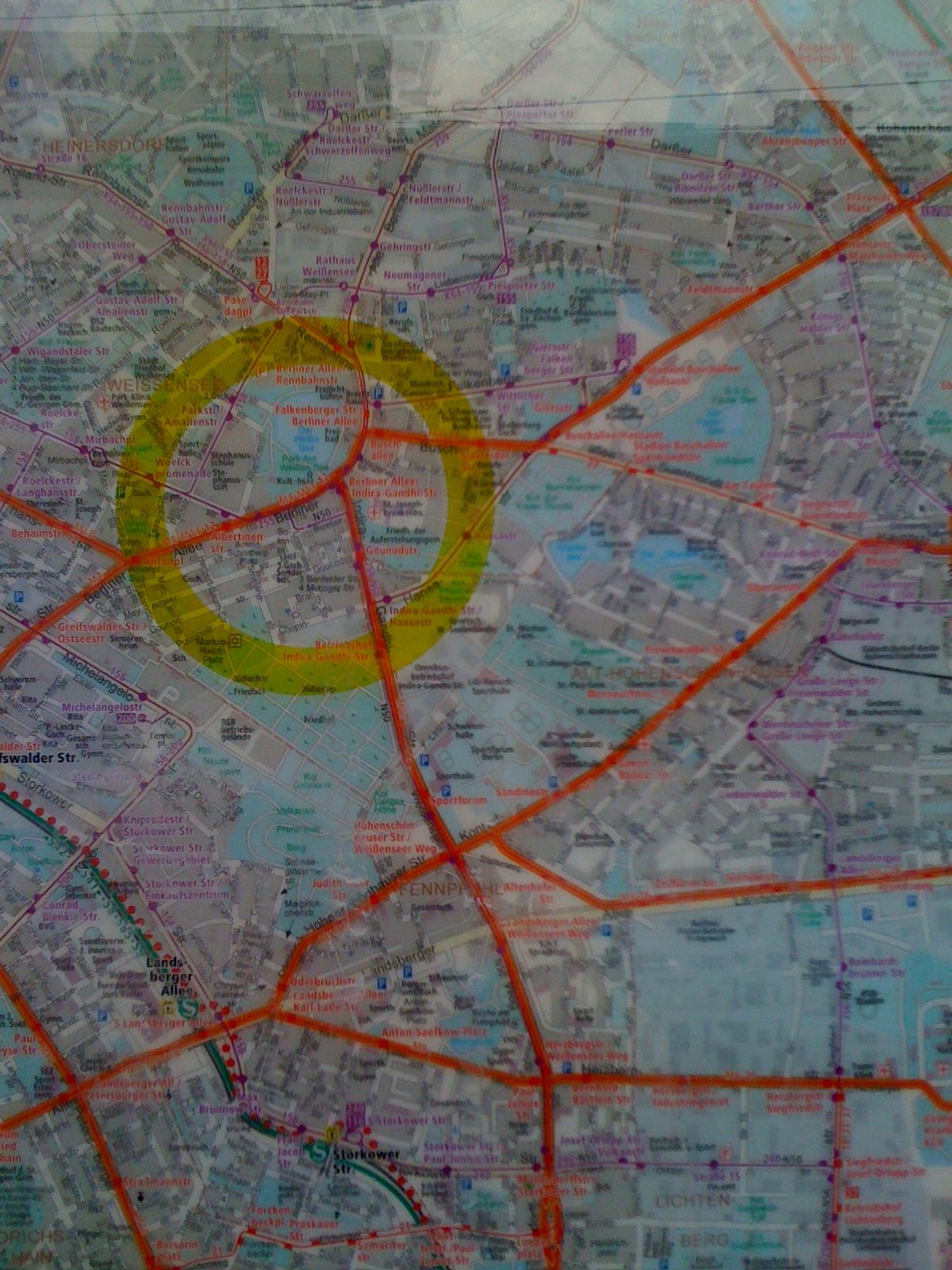 Es gibt zwei Karten an der S-Bahn-Station Landesburger Allee und Petersburger Str. Der gelbe Kreis auf einer Karte ist an der falschen Stelle.