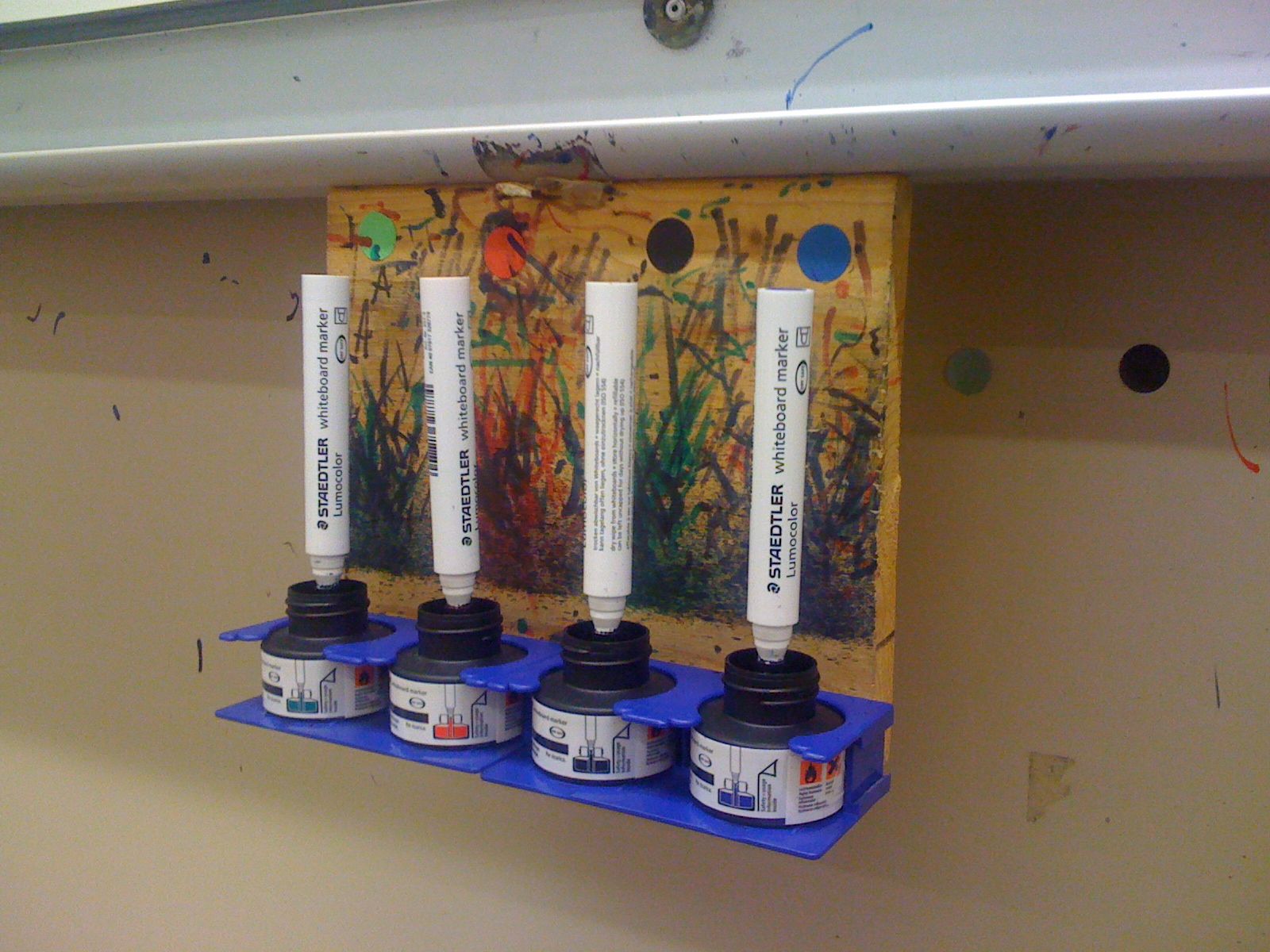 The dry-erase markers are even better. There are four colours (red, green, blue, and black) and each has its own inkwell that holds the marker when not in use. This has two functions. The first is that it keeps the tip from drying out. The second is that it refuels the marker. This is a great system as it is probably way cheaper over the lifetime of the marker (the tips will eventually wear out) but it probably costs more initially.