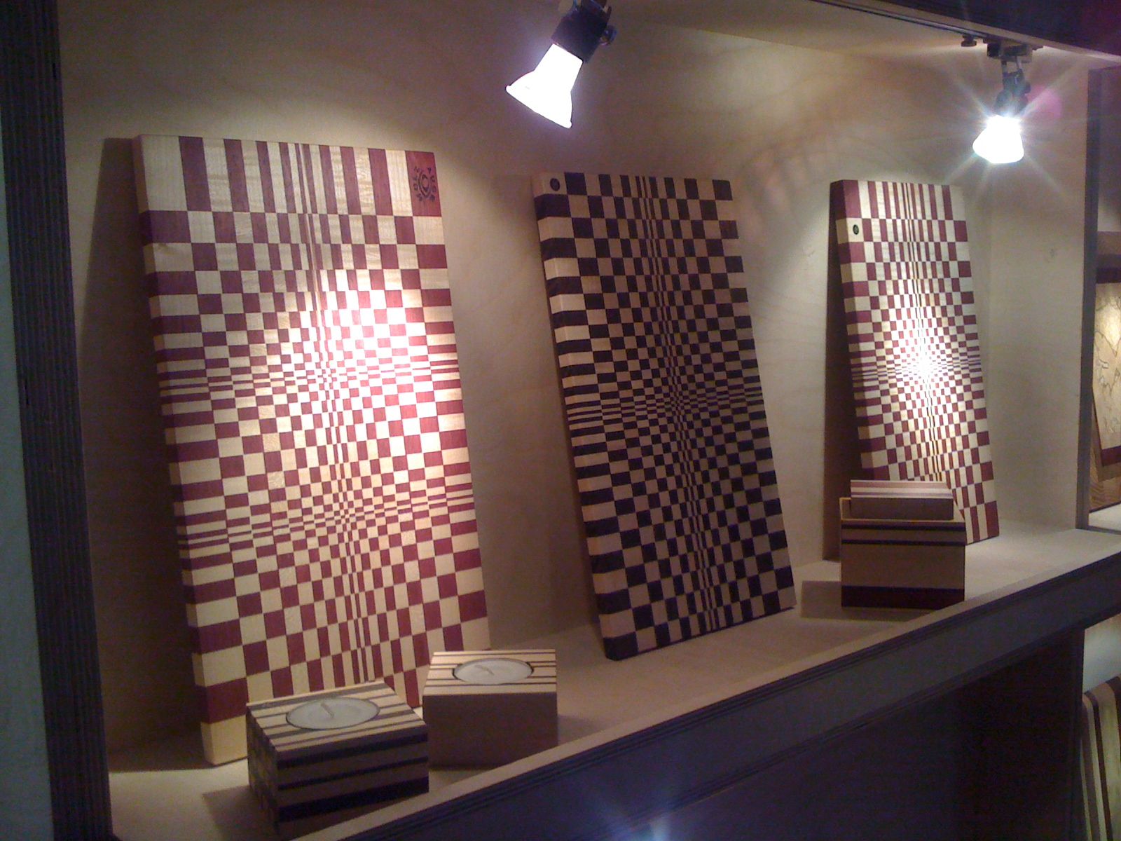 David makes objects, art, and mosaics. His medium is wood – exclusively. His works are all hand made, high-quality, one-of-a-kind, pleasant to the touch, and mesmerizing to the eye. He does not use any dies or stains or paint – each piece is its natural colour. He uses over forty different types of wood to some very dramatic results. The boxes have no metal hinges or felt interiors. The mosaics feel like they came from a single block. Truly remarkable.