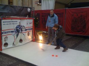 There was also a booth set up by my new favorite radio station – Berliner Rundfunk 91.4. They were promoting the Berlin Eisbären (hockey team) and they had set up mini-rink where one could try and shoot the puck through a goalie made of vinyl. I did poorly but the guy was nice and gave me a prize anyway.