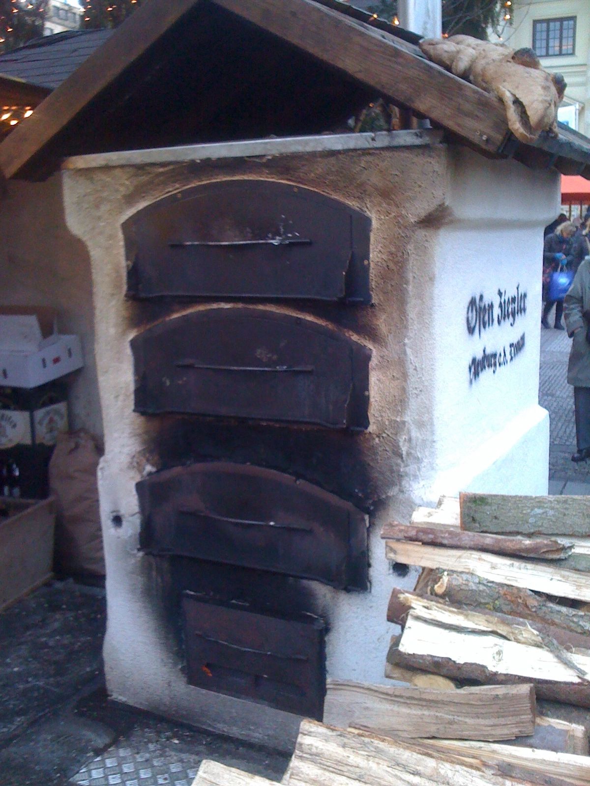 Yesterday I went to the Christmas Market and one of the booths had the exact same wood-burning three-level oven from the Weihnachtsmarkt in Leipzig. This tells me that it was not custom made and I bet, if one were so inclined, you could find these things for sale on the Internet and they probably won’t be that expensive. This guy was selling a different type of bread-cheese-meat thing.
