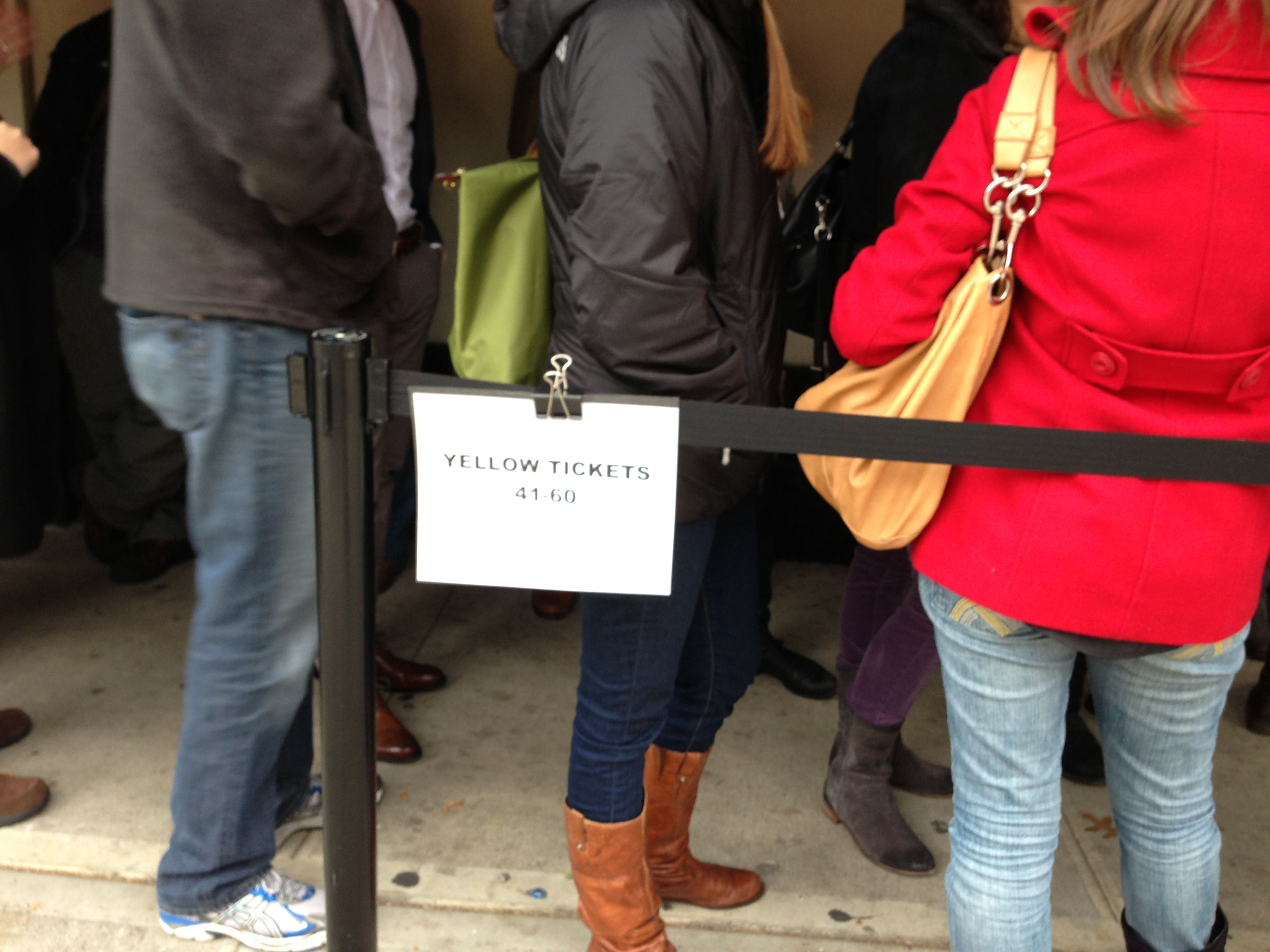 3. With the line stretching the length of the building and most of the way back, the doors opened at 14:30 and the tickets were distributed. Each ticket was numbered with the first person in line getting number one, the second person getting number two and so on. The low-numbered tickets were yellow. The higher-numbered ones blue.