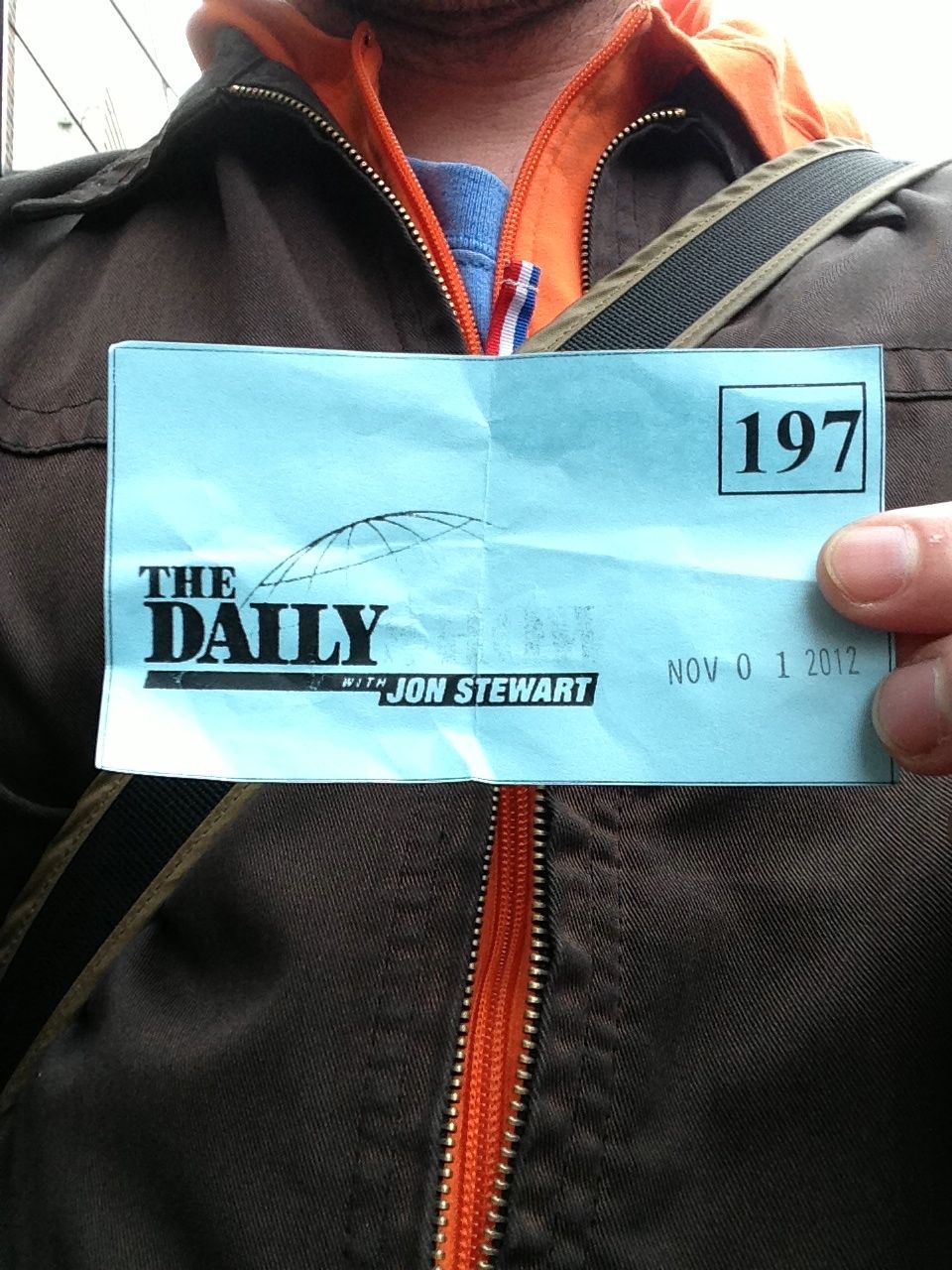 The Internet has a lot of words describing how to get standby tickets for the Daily Show. But after experiencing it first hand, I found the current information to be inaccurate in some areas and lacking in others. So, to add to the confusion here is a description of my experience getting standby tickets for the November 1, 2012 edition of The Daily Show with Jon Stewart.
