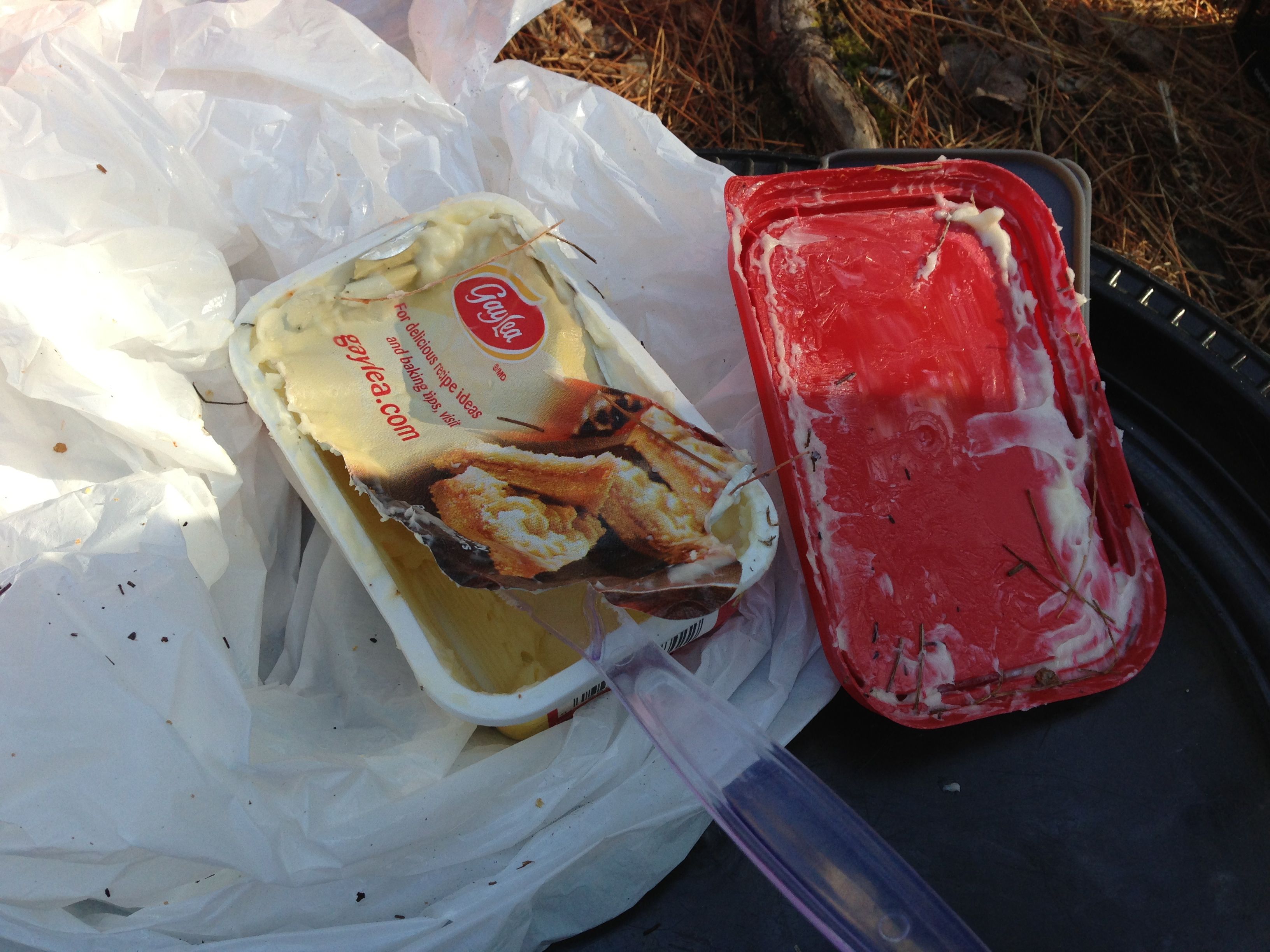 Reason the third: humans waste way too much food unnecessarily. You know how when you’re at home and a piece of bread falls on the ground and you have no choice but to throw it away or give it to your older brother for his sandwich? Well when you’re camping and something gets dirty, you can’t just walk over to Ayoub’s to buy a replacement because Ayoub’s is 240 km away. So what ends up happening is that your food-cleanliness tolerance drops considerably. Want proof? Check out our margarine. It was like this before we even set out in the canoes on the first day. No one cared or got sick.